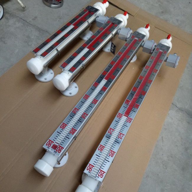 液位計根據浮力原理,浮子在測量管內隨液位的升降而上下移動,浮子內的永久磁鋼通過磁耦合作用,驅動紅、白色翻柱翻轉180’液位上升時,翻柱由白色轉為紅色,下降時,翻柱由紅色轉為白色,從而實現液位的指示。