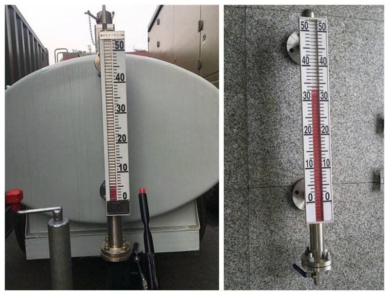 液位計根據浮力原理,浮子在測量管內隨液位的升降而上下移動,浮子內的永久磁鋼通過磁耦合作用,驅動紅、白色翻柱翻轉180’液位上升時,翻柱由白色轉為紅色,下降時,翻柱由紅色轉為白色,從而實現液位的指示。