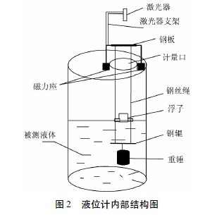該方案的設計結構圖如圖2所示。它主要由雙頻激光干涉儀、雙浮子(內設錐體棱鏡)、導向鋼絲繩等組成。激光器和浮子用于液位測量。