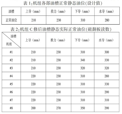 機(jī)械油位無定值,機(jī)組C修時(shí)油槽實(shí)際加油油位與設(shè)計(jì)靜態(tài)油位存在偏差,實(shí)際靜態(tài)正常油位詳見表2。