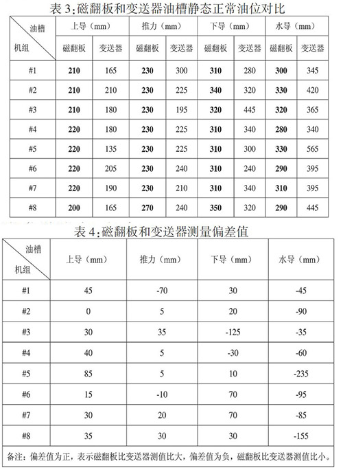 3)通過表3、表4,可以看出磁翻板耐酸堿磁翻板液位計(jì)廠家油位和變送器油位測值存在偏差,導(dǎo)致變送器油位測值不能直接反映油槽實(shí)際油位的高低,需要結(jié)合磁翻板和變送器的偏差值才能得出油槽實(shí)際油位,故建議下個(gè)檢修期時(shí)重新修正油位變送器的量程,使靜態(tài)下變送器油位測值與磁翻板油位保持一致,運(yùn)行時(shí)能夠直接反映油槽實(shí)際油位的高低;