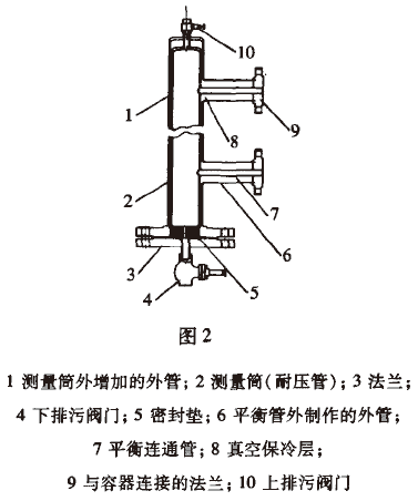 在原有的液位計結構基礎上,在測量筒外增加一真空保溫層。由于測量筒中的液體跟容器中的液體是相同的,故測量筒外的真空保溫層阻隔了測量筒內的低溫液體與外界空氣的溫度影響。實踐證明。此項改進確實起到了良好的隔溫作用。但此結構在實際裝置運行中,平衡連通管周圍會凝結出大量冰塊。通過分析,由于測量筒與容器間是通過上下兩根平衡管相連接的,在液位計可正常指示時,下平衡管中始終充滿低溫液體。因在測量筒外增加的真空保溫層不能阻隔平衡管與外界的直接接觸,故在平衡管四周還是會出現大量的冰塊。