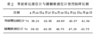 另外,2012年新建20萬t/a合成氨系統2000m³液氨球罐上安裝有一臺LD51纜式導波雷達液位計(位號:LT1201A)和一臺磁翻板液位計,該信號均引入DCS顯示。在開始安裝調試過程中發現雷達液位計與磁翻板液位計顯示不一致,經檢查發現導波雷達液位計取樣管原始高度不正確,經重新調整并對其相關參數進行設定后測量顯示一致。長期穩定運行,給工藝控制提供了準確數據,滿足了工藝要求,有效地保障了設備和人身安全。2014年4月儀表人員抽樣比測記錄數據,見表2所示。