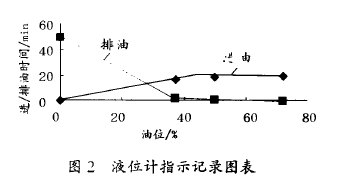 編程實現計算機畫面實時顯示油位(0% ~100%)和油位高、低的報警功能。我們用差壓法測量貯罐油位,如圖6所示,開氣閥時,油位回落較快;關氣閥時,油位上升緩慢(每小時7%)??梢詫⒐ぷ饔臀桓呶辉O在65%,油位從該點升至*限高位(80%),用時估計為2h。工作油位低位在55%~60%處,預警時間將提前20s以上,工作控制油位整體提高也利于潤滑設備的安全。因此,設定油位低于60%作為關閉氣閥條件,高于65%作為打開氣閥條件,用雙位式調節法代替原來的延時選通位式調節,控制油位在一定范圍內。保留了原有油位故障處理程序。