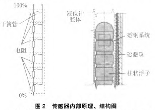 傳感器的作用是采樣液位高低位置并轉換成標準信號傳送至控制室,傳感器實際由干簧管和電阻組成。當浮子內磁鋼位置變化后,磁場通過器壁帶動傳感器內干簧管觸點吸合。干簧管吸合的位置決定回路的阻抗大小,干簧管的通常位置為10mm1組。回路的大小正好與液位的高低成正比,這樣*后由置于傳感器外殼內的變送器將電阻信號轉換成標準的電流信號,送至控制室。具體結構、原理圖見圖2。