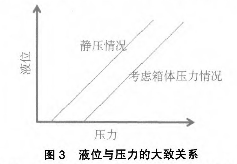 針對設備的故障,技術人員采取了更換多種質量好的磁感應開關(如耐高溫型等),以及基于磁翻板的外貼式模擬量液位控制,但效果均不理想。其他液位測量(如超聲波等)造價較高,而且需要對設備進行相應的改造,并且停運一段時間,而該系統屬于公用,上述條件均無法滿足。既要實現自動控制,又要相應允許實施。技術人員再次結合系統圖進行了分析:該水位溢流處和下限處范圍還是比較寬裕,而且箱體為非承壓容器,所以箱體內的壓力和大氣壓相差不大,即便是有也基本上保持恒定,結合原水位測量的結構,考慮在帶報警開關磁翻板液位計的液位測量筒下部加裝1臺壓力變送器,在箱體壓力不是很大且基本恒定的情況下,液位與壓力值基本成對應關系(只是在現場修正疊加一個常數值來消除箱體上不恒壓所帶來的偏差)。液位與壓力的關系曲線見圖3。