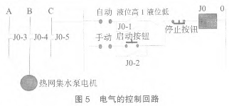 電氣的控制回路見圖5,這樣將數顯表的接點引入控制回路,可以實現液位高低的自動控制。同時見圖5集水箱帶報警開關磁翻板液位計下測點位置與變送器的位置之間可以存一段冷卻后的水,這樣可以保證變送器不會被高溫度的疏水而損壞。