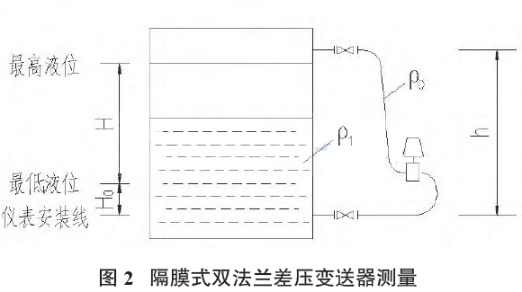 因氨為腐蝕性介質(zhì),故應采用隔膜式的雙法蘭差壓變送器,ρ0為毛細管中所充硅油的密度,h為兩個法蘭中心高度之差。