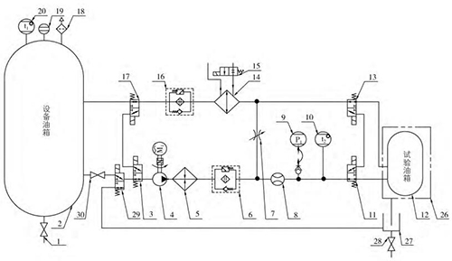 油液循環:當*次試驗補油完成后,L 形三通電動閥(3、17、11、13)切換工作位置,油液經油泵 (4)、加熱器(5)、供油過濾器(6)、流量計(8)、L 形三 通電動閥(11)、 被測油箱(12)、L 形三通電動閥(13)、油水換熱器(14)、 回油過濾器(16)、L 形三通電動閥(17、3、29)后,此時油液不回到設備油箱,而是直接進入油泵吸油口,形成一個閉式循環系統。系統中流量計始終檢測當前閉式系統供給被測油箱的流量,閉式系統的優點在于始終保持被測油箱中的油液的位置。