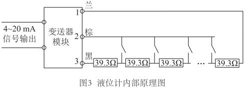 為尋求更好的改進方案,對防爆磁翻板液位計的測量原理進行了深入研究。液位計測量桿中是由等間距排布的干簧管和電阻元件組成,當磁浮子達到某一高度時,對應的干簧管閉合,如果能識別出哪個干簧管閉合,即可獲得當前液位值。那么變送器又是如何識別出哪個干簧管閉合的呢?再次探究測量桿內部電路,繪制液位計內部原理圖,如圖3所示。測量桿內部電阻串聯連接,每兩個電阻的連接處連接干簧管的一端,干簧管的另一端并聯連接,*終引出蘭、棕、黑三根信號線。