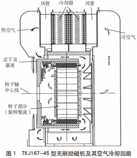 某核電廠的勵磁機采用ALSTOM生產的TKJ167-45 型無刷勵磁機,該型號的勵磁機采用循環空氣冷卻,兩臺空氣冷卻器并排安裝在勵磁機的正上方,冷卻空氣在冷卻器、風管以及勵磁機外罩連接形成的閉合風路中進行強迫循環,具體情況如圖 1 所示。