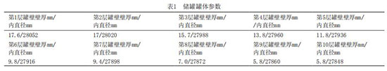 (1)改造前對儲罐的罐體進行了超聲波測厚以及材料的化學成分及性能分析,其材質(zhì)滿足現(xiàn)行的使用條件,其儲罐的罐體參數(shù)及每層罐壁的厚度(實測)見表1,罐壁的每層壁板高度為1690mm,其搭接寬度為40mm,縱焊縫為對接結(jié)構,見表1。