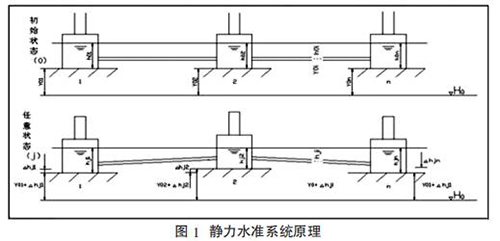 靜力水準儀依據(jù)連通管的原理,采用振弦式傳感器,測量每個測點 容器內(nèi)液面的相對變化,再通過計算公式求得相對于基準點的沉降量,如圖 1 所示。