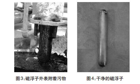 經(jīng)過兩年多運行,污水罐內(nèi)可能沉淀污泥雜質(zhì)導致液位計示數(shù)不準。現(xiàn)場拆卸液位計,并且對浮球和磁浮子進行清洗。(圖3-圖4)