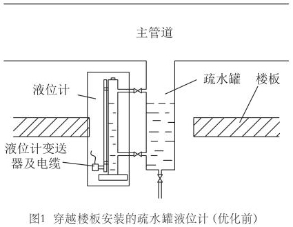 田灣核電3#、4#機(jī)組現(xiàn)場疏水罐液位測量*先采用兩個連通管把液位計測量筒與疏水罐連通,測量筒內(nèi)部含有磁浮子,磁浮子高度隨疏水罐內(nèi)液位變化,測量筒外部安裝測量桿,感受磁浮子高度,再通過下部變送器轉(zhuǎn)化成電流信號輸出到DCS系統(tǒng)。一些蒸汽管道安裝布置貼近地面,疏水罐穿越樓板,這樣就使液位計安裝后變送器位于樓板下部,即下一層廠房的房頂;如圖1所示。