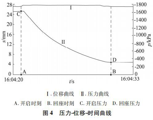 運(yùn)用安全閥冷態(tài)試驗(yàn)裝置對(duì)該凝結(jié)水液位計(jì)進(jìn)行動(dòng)作性能試驗(yàn),將試驗(yàn)容器內(nèi)的介質(zhì)壓力卸放到整定壓力以下,開啟試驗(yàn)容器和安全閥進(jìn)口端的球閥,關(guān)閉流量計(jì)管路閥門,開啟主測(cè)試管路截止閥,開啟儲(chǔ)氣容器通向試驗(yàn)容器的節(jié)流閥,逐漸加壓,同時(shí)啟動(dòng)計(jì)算機(jī)數(shù)據(jù)采集系統(tǒng),被試安全閥開啟,繼續(xù)升高壓力,直至被試安全閥保持全開啟( 排放) 狀態(tài),然后關(guān)閉儲(chǔ)氣容器通向試驗(yàn)容器的閥門,被試安全閥亦逐漸關(guān)閉。計(jì)算機(jī)自動(dòng)生成試驗(yàn)過程的壓力、位移曲線,試驗(yàn)人員記錄采集開啟壓力、排放壓力、回座壓力、開啟高度等數(shù)據(jù)。重復(fù)上述試驗(yàn)至少 3 次,得到相應(yīng)壓力-位移-時(shí)間曲線,見圖 4。左縱坐標(biāo)為位置,右縱坐標(biāo)為壓力,其中上部曲線代表導(dǎo)閥位移,下部曲線代表壓力變化。當(dāng)導(dǎo)閥位置發(fā)生變化,代表導(dǎo)閥開始開啟動(dòng)作,此時(shí)的壓力為該凝結(jié)水液位計(jì)的開啟壓力,即整定壓力; 當(dāng)導(dǎo)閥位置回到原點(diǎn)代表導(dǎo)閥已經(jīng)回座,此時(shí)對(duì)應(yīng)的壓力即為回座壓力。