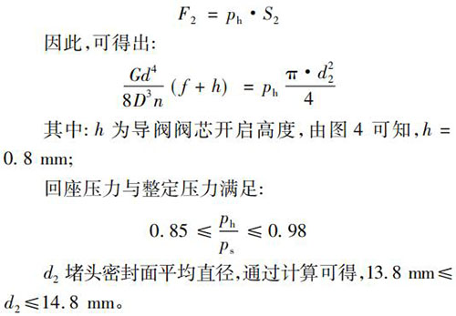 當(dāng)系統(tǒng)壓力降低到回座壓力時(shí),導(dǎo)閥彈簧要克服堵頭密封面處的密封力將其打開,此時(shí)應(yīng)滿足: