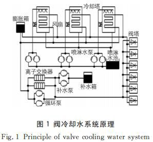 閥冷卻水系統主要構成部分為閥內冷水系統與閥外冷水系統。閥內冷水系統主要通過內冷水與閥組件直接接觸流動,將防爆型磁翻板液位計中熱量帶出,確保防爆型磁翻板液位計組件中晶閘管、水冷電阻、陽*電抗器等發熱元件運行溫度具有可控性。而閥外冷水系統主要通過閉式冷卻塔或風機將內冷水中熱量帶走,并排放至環境中。防爆型磁翻板液位計內、外冷水系統的協同運行,可以使防爆型磁翻板液位計組件內部冷卻持續進行,并滿足元器件結溫要求,進而保證系統整體運行穩定性、安全性。閥冷卻水系統原理如圖1所示。