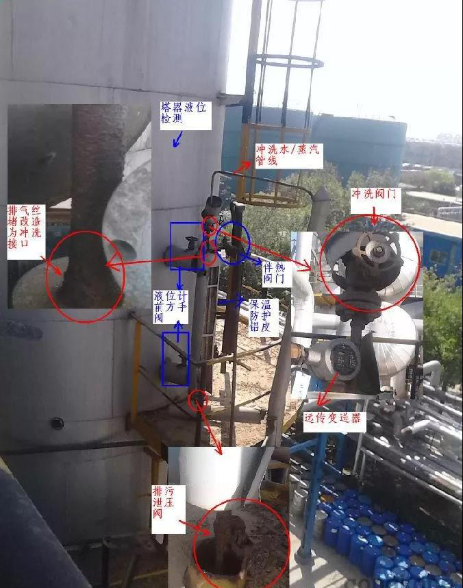 外裝式浮子液位計(jì)在實(shí)際清污中,對于現(xiàn)場安裝環(huán)境惡劣險(xiǎn)峻不易拆卸的情況下,進(jìn)行維護(hù)改進(jìn)。利用測量筒上部的排氣絲堵,引進(jìn)蒸汽和清水管線,可以在不拆卸磁浮子的情況下進(jìn)行一定程度的除污清洗。