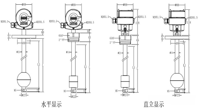 為更直觀地給用戶展現(xiàn)不銹鋼浮球液位計(jì)的規(guī)格,請(qǐng)參考兩種不銹鋼浮球液位計(jì)水平顯示以及直立顯示的不同規(guī)格尺寸,如下圖所示: