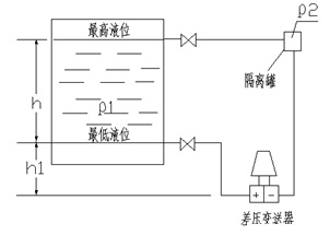 壓力式液位計(jì)采用靜壓測量原理,當(dāng)液位變送器投入到被測液體中某一深度時(shí),傳感器迎液面受到的壓力的同時(shí),通過導(dǎo)氣不銹鋼將液體的壓力引入到傳感器的正壓腔,再將液面上的大氣壓 Po 與傳感器的負(fù)壓腔相連,以抵消傳感器背面的 Po ,使傳感器測得壓力為:ρ.g.H ,通過測取壓力 P,可以得到液位深度。