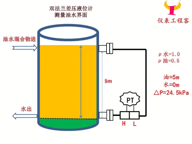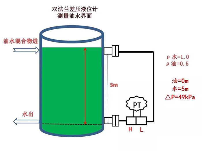水的密度為1.0,油的密度為0.5,變送器的硅油密度為0.93,測量范圍5m,求水面在5m時變送器的差壓值。