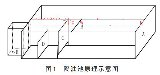 A 為隔油池入口,鉆井、試油、修井作業過程中產生的廢水進入隔油池后,因油和水的密度不同而在沉降池中上下分離,分離出的污油通過閥桿旋轉的收油槽 B 進入收油池,用罐車拉運至輪南環保站回收處理。分離出的污水經隔油擋板 C 從擋板底部進入集水池,由液面高度擋板 D 的高度來維持油水界面,保證將油污隔離在沉降池中。隔除污油的污水自擋板 D 上部翻入排水池后,再進入緩沖池,經排水口 E 排出,進入污水蒸發池自然蒸發。在隔油池中沉淀下來的重油及其他雜質,定期清淤,用罐車拉運至輪南環保站回收處理。