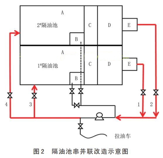 為延長含油污水沉降時間,提高分離效果,對隔油池進行流程改造。如圖 2 所示,A 為沉降池,B為 收 油 池 , C 為 集 水 池 , D 為 排 水 池 , E 為 緩 沖池。增加流程 1 至流程 4,含油污水在 1#隔油池沉降分離后,可通過流程 1、3 重新打入 1#隔油池,也可通過流程 1、4 打入 2#隔油池;含油污水在 2#隔油池沉降分離后,可通過流程 2、3 打入 1#隔油池,也可通過流程 2、4 重新打入 2#隔油池。隔油池流程可串聯或并聯,實現了互聯互通。正常情況下,含油污水在 1#隔油池沉降分離后,通過流程 1、4 打入 2#隔油池,實現 2 個隔油池串聯使用。另外,在隔油池出口管線上連接耐腐蝕軟管,并將其固定在龍門架上,實現流程關斷,有效防止隔油池低液位卸車時油污直接沖進蒸發池。在蒸發池增設攔油繩,將污油聚集在有限范圍內,用臨時泵連接軟管將油污打入隔油池。通過以上措施,充分保證隔油效果,進蒸發池水質清澈無油污。