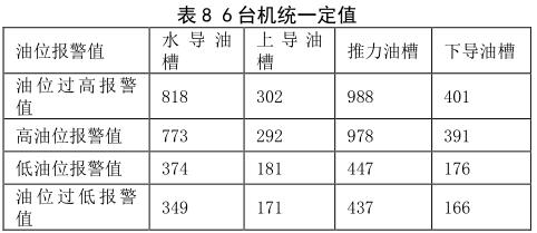 (2)依據(jù)成都勘測(cè)設(shè)計(jì)院給的定值要求,建議每臺(tái)機(jī)設(shè)置不同的報(bào)警值。設(shè)置原則:在上導(dǎo)、下導(dǎo)、推力各部油槽油位,結(jié)合機(jī)組運(yùn)行時(shí)的油位*大值上設(shè)置高油位報(bào)警值+20mm、過高油位報(bào)警值 +30mm;*低油位值上低油位報(bào)警值 -20mm、低油位停機(jī)值 -30mm;水導(dǎo)油槽油位:高油位報(bào)警值 +45mm、過高油位報(bào)警值 +90mm;*低油位值上低油位報(bào)警值 -130mm、低油位停機(jī)值 -155mm;躲過報(bào)警值。在此基礎(chǔ)上,真實(shí)的油位只會(huì)下降,設(shè)置值對(duì)油位的運(yùn)行是安全的。分析確定的#1-#6 機(jī)組各油槽油位的動(dòng)態(tài)油位報(bào)警值,即機(jī)組運(yùn)行時(shí)油槽油位的過低、低、高、過高報(bào)警定值如下,可以選擇表 9 的數(shù)據(jù) 6 臺(tái)機(jī)分別進(jìn)行定值,同時(shí)也提供定值表 10 進(jìn)行 6 臺(tái)機(jī)統(tǒng)一進(jìn)行定值。