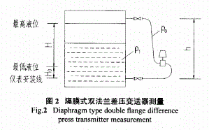 因氨為腐蝕性介質,故應采用隔膜式的雙法蘭差壓變送器,ρ0為毛細管中所充硅油的密度,h為兩個法蘭中心高度之差。
