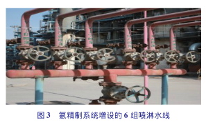 2)液氨儲罐增設(shè)噴淋系統(tǒng)。液氨易溶解于水,裝置增設(shè)霧狀水噴淋系統(tǒng)后,一旦液氨泄漏,從現(xiàn)場打開水噴淋系統(tǒng),就可*大減少氨的揮發(fā)。另外氨具有較高的體積膨脹系數(shù)。如:滿量充裝液氨的鋼瓶,在0~60℃范圍內(nèi),液氨溫度每升高1℃,其壓力升高約1.32~1.80MPa,致使液氨氣瓶超裝*易發(fā)生爆炸。為此液氨裝車點、液氨儲罐設(shè)置了降溫噴淋裝置。同時,要求用罐車?yán)\液氨時,其充裝系數(shù)不得大于0.9。在新建120t/h的酸性水汽提裝置中,不但在液氨儲罐上增設(shè)噴淋系統(tǒng),而且在粗氨分液罐、氨結(jié)晶器、氨液循環(huán)罐等6組設(shè)備均增設(shè)了噴淋系統(tǒng)。具體見圖3。