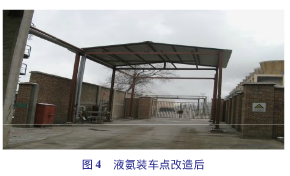 4)液氨裝車點移位改造。液氨裝車點不規(guī)范。根據(jù)相關(guān)要求,液氨裝車時,周圍不能有機(jī)動車通行,但液氨裝車點位于14號馬路西側(cè)5m處,對車輛及施工人員并無法完全封閉,裝車存在很大的安全風(fēng)險。以前,液氨裝車由汽提崗位外操負(fù)責(zé),由于外操工作繁忙,造成液氨裝車過程的監(jiān)督時斷時續(xù),為解決這一隱患,車間指派專人負(fù)責(zé)監(jiān)管液氨裝車的全過程。監(jiān)管人員不但要檢查接頭有無泄漏,還要核實駕駛員和押運員的資質(zhì)。車間根據(jù)液氨裝車的實際情況,編制《液氨裝車泄漏應(yīng)急操作卡》、《液氨裝車操作規(guī)程》,以便進(jìn)一步規(guī)范液氨裝車操作程序。應(yīng)分開設(shè)置液氨裝卸站的進(jìn)出口,當(dāng)進(jìn)出口合用時,站內(nèi)應(yīng)設(shè)回車場。由于液氨裝車點東側(cè)5m處就是煉油區(qū)雨排系統(tǒng),為了解決液氨裝車過程泄漏噴淋水污染公司煉油區(qū)雨排系統(tǒng),在裝車點東西側(cè)各增設(shè)圍堰。從圖4可以看出:液氨裝車點改造后,現(xiàn)場更為規(guī)范,管理更為嚴(yán)格。